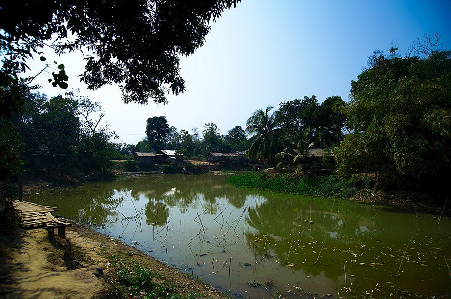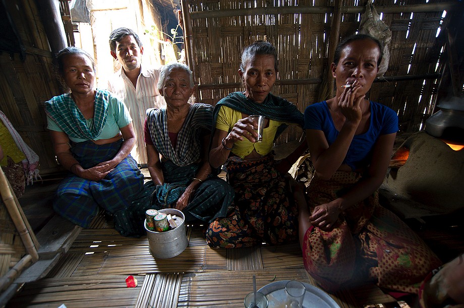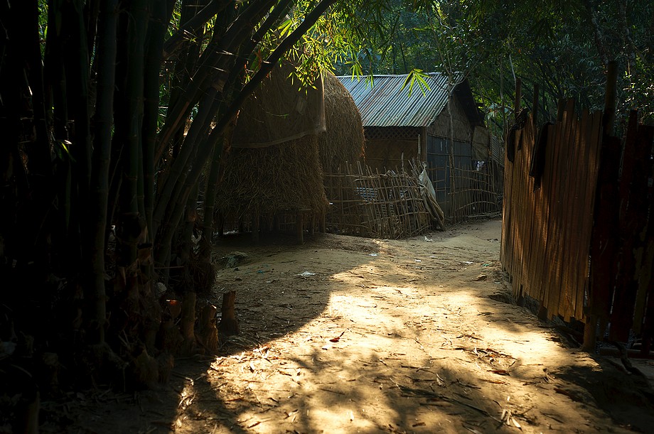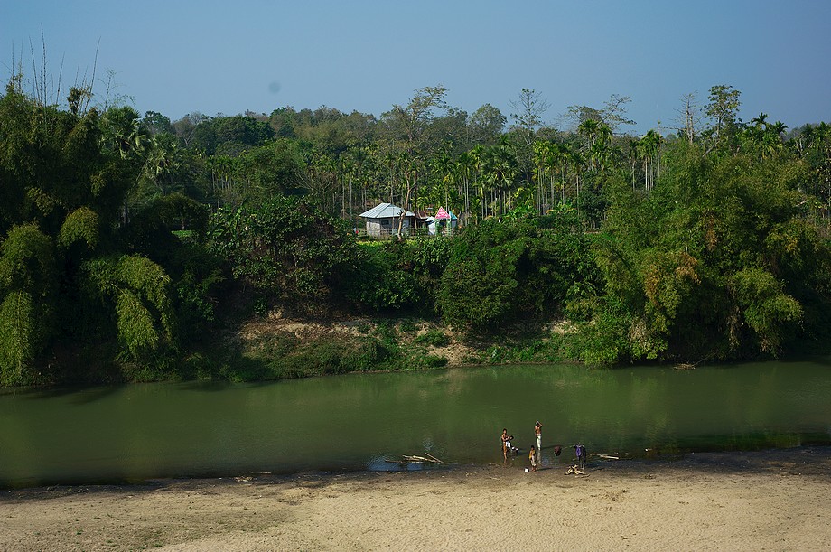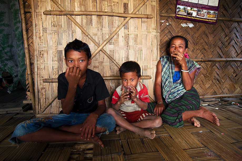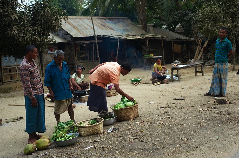 Zgodnie z zaleceniem pana asystenta superintendenta z Ramgarhu idę na policję się zameldować. Policjant nie za bardzo wie o co chodzi, po krótkim namyśle podaje mi rękę, mówi „See you around” i daje do zrozumienia, że to już wszystko. No dobra, ja swoje zrobiłem. Idę się przejść, doczepia się jakiś denerwujący chłopaczek, ale po dosyć długim marszu ze mną i paru dłuższych postojach na herbatkę, podczas których wyraźnie mu się nudzi, kapituluje i wraca do domu. Z panem z indyjskiej Tripury imieniem Rinku lat 30 idę do najpierw do domków plemienia Marma, ale nic ciekawego tam nie ma, potem do następnej wsi, gdzie mieszkają przedstawiciele ludu Chakma. Tam można było zrobić parę fajnych zdjęć, bo była impreza, niestety smutna – pogrzeb – więc się wstrzymuję. W jednym z gospodarstw siedziało kilku mnichów oraz tłum pogrzebowych gości, recytując mantrę. Kawałek dalej Rinku chce żebym mu zrobił zdjęcie jak się popisuje chwytami karate jarając w tym samym czasie fajkę. Za rzeką podobno jest już Tripura, znowu średnio to zgodnę jest z mapą, wg. której tym razem do granicy jest jakieś 20km, ale nie mam na razie jak sprawdzić na gmapsach. Możliwe, że tutaj ja nie do końca zrozumiałem. Wracamy do głównej drogi, przy jednym z domków siedzi starsza pani o imieniu Gonga i pali wielką faję, coś co się nazywa daba, jest zrobione z bambusa (a może właśnie daba oznacza bambus) a to co się pali nazywa się kolki, ale to już nie wiem co to jest, chyba po prostu zwykły tytoń.
