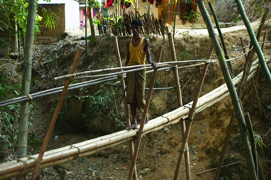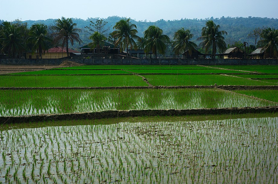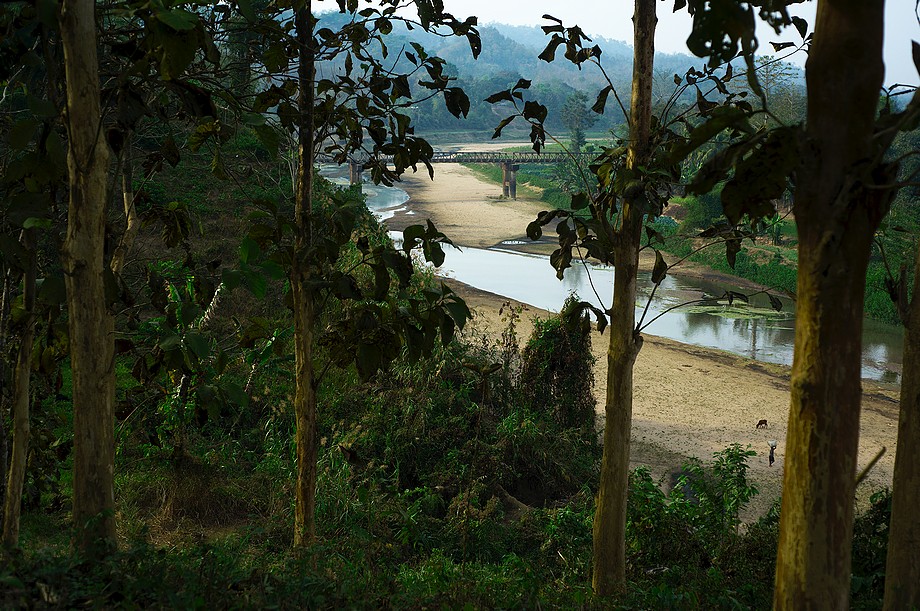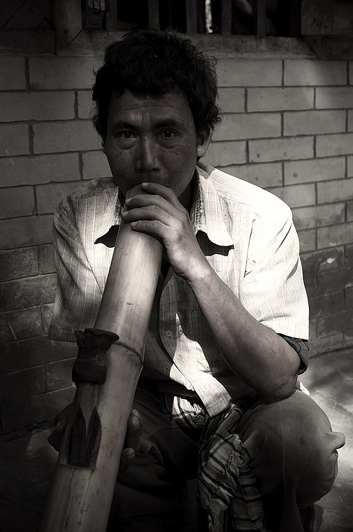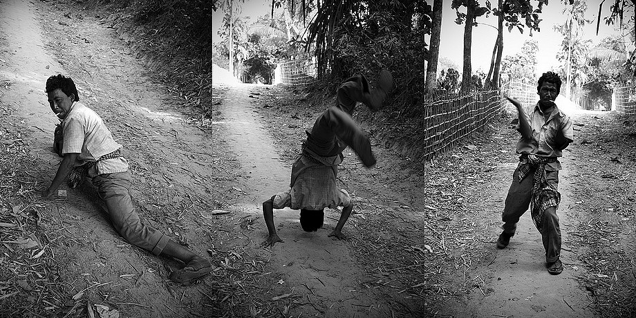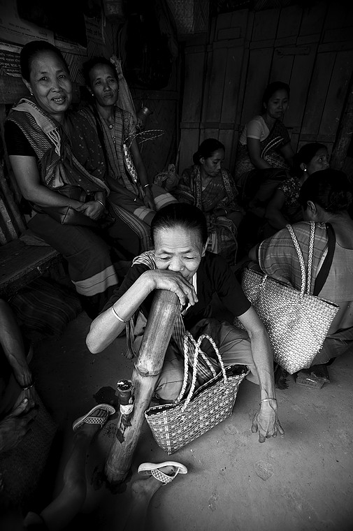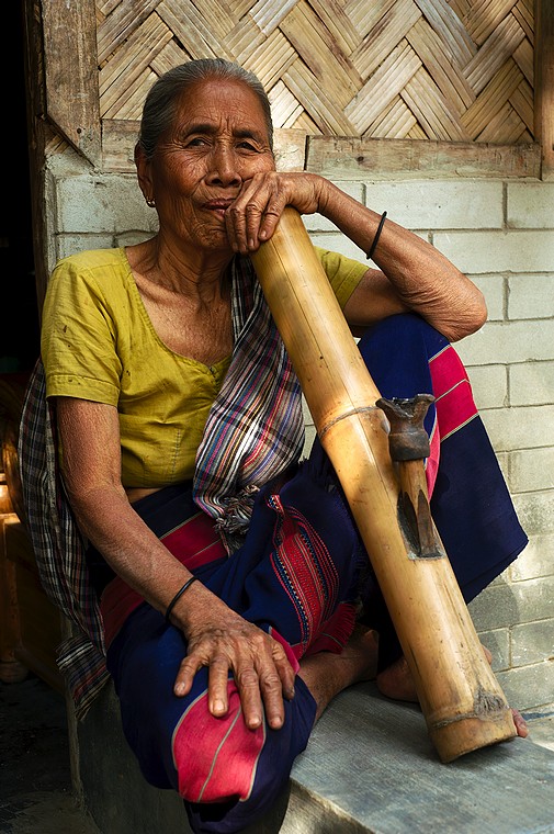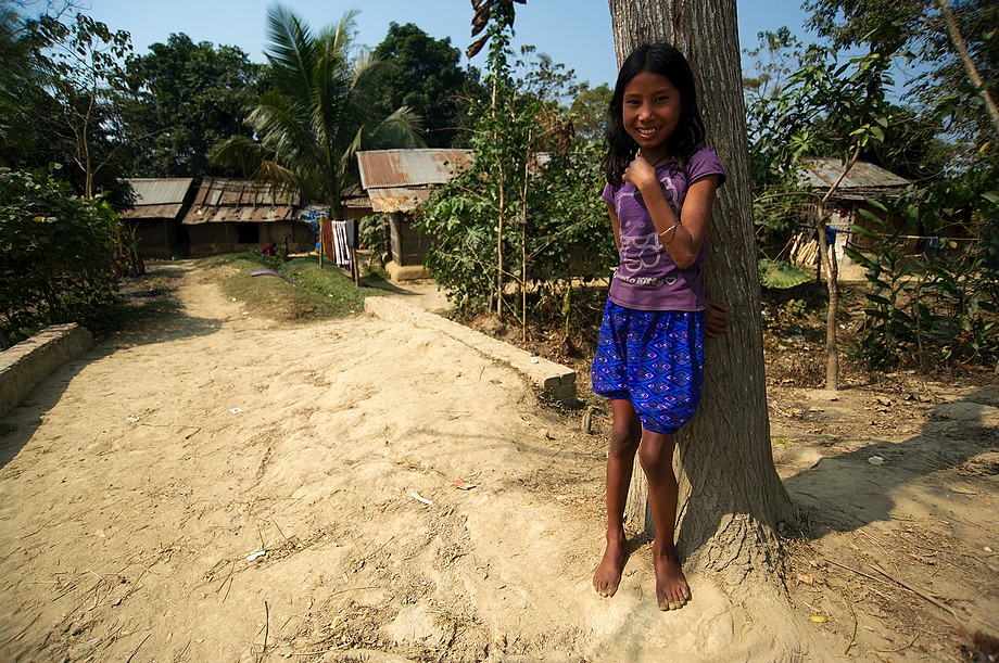 Zgodnie z zaleceniem pana asystenta superintendenta z Ramgarhu idę na policję się zameldować. Policjant nie za bardzo wie o co chodzi, po krótkim namyśle podaje mi rękę, mówi „See you around” i daje do zrozumienia, że to już wszystko. No dobra, ja swoje zrobiłem. Idę się przejść, doczepia się jakiś denerwujący chłopaczek, ale po dosyć długim marszu ze mną i paru dłuższych postojach na herbatkę, podczas których wyraźnie mu się nudzi, kapituluje i wraca do domu. Z panem z indyjskiej Tripury imieniem Rinku lat 30 idę do najpierw do domków plemienia Marma, ale nic ciekawego tam nie ma, potem do następnej wsi, gdzie mieszkają przedstawiciele ludu Chakma. Tam można było zrobić parę fajnych zdjęć, bo była impreza, niestety smutna – pogrzeb – więc się wstrzymuję. W jednym z gospodarstw siedziało kilku mnichów oraz tłum pogrzebowych gości, recytując mantrę. Kawałek dalej Rinku chce żebym mu zrobił zdjęcie jak się popisuje chwytami karate jarając w tym samym czasie fajkę. Za rzeką podobno jest już Tripura, znowu średnio to zgodnę jest z mapą, wg. której tym razem do granicy jest jakieś 20km, ale nie mam na razie jak sprawdzić na gmapsach. Możliwe, że tutaj ja nie do końca zrozumiałem. Wracamy do głównej drogi, przy jednym z domków siedzi starsza pani o imieniu Gonga i pali wielką faję, coś co się nazywa daba, jest zrobione z bambusa (a może właśnie daba oznacza bambus) a to co się pali nazywa się kolki, ale to już nie wiem co to jest, chyba po prostu zwykły tytoń.