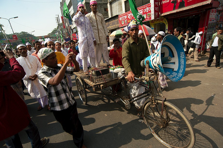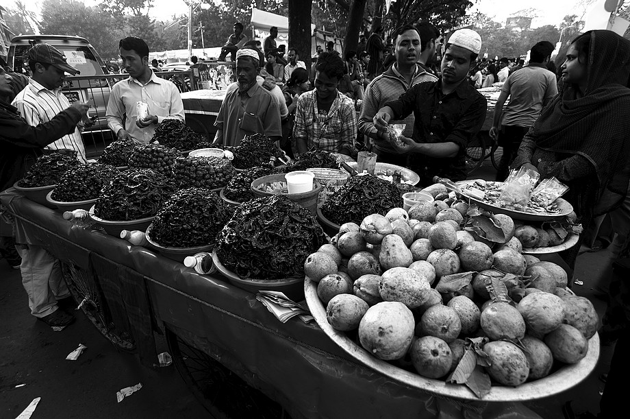 Pijąc herbatkę zaczynają się złazić ludzie, obgadywać, robić zdjęcia komórkami. Jestem w Bangladeszu na 200%. Kilometr dalej jest skrzyżowanie, przy którym jest coś a la bus stand, kasa biletowa, knajpa i aptekarz z telefonem. Bus do Rajshahi odjeżdża o 14:50, jedzie 2:30h i kosztuje 115Tk. Obiad (ryż, kurczak, warzywa gotowane i surowe) 60Tk, czyli 2,40PLN. Telefon do Asita z Rajshahi nic nie kosztuje, bo Asit nie odbiera, nie odebrał też kiedy dzwoniłem do niego dwa dni wcześniej z Kalkuty. Coż, nie mam więc powodu do zostawania w Rajshahi, pewnie wezmę nocny bus do Dhaki. W autobusie oczywiście też ludzie zagadują, czasem w hindi, czasem w angielskim. Gość z siedzenia obok chce mi pomóc znaleźć bilet do Dhaki. Dojeżdżamy do Rajshahi. Sąsiad wysiada pierwszy, ja parę osób po nim. Dochodząc do drzwi słyszę wołanie „Jasek! Jasek!”. I tu chwila konsternacji, bo w zasadzie wszystkim dookoła mówię, że jestem „Dżek”, ale jeśli to nie sąsiad to kto? Przed autobusem czeka Asit, który chwilę po moim telefonie do niego oddzwonił do aptekarza, który mu powiedział, że jadę do Rajshahi. Megasurprise, jedziemy razem rikszą do znajomego już hotelu Sky (Malopara, blisko Sahib Bazar Rd, singiel za 200Tk), potem herbatka, żarcie (ryż, kilka wersji warzyw i ryb, kurczak, duża cola – 134Tk, niecałe 6PLN za dwie osoby), hotel, net, kino na laptopie, spać.