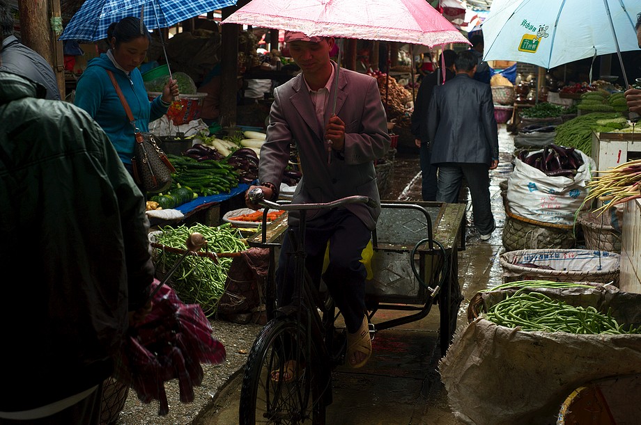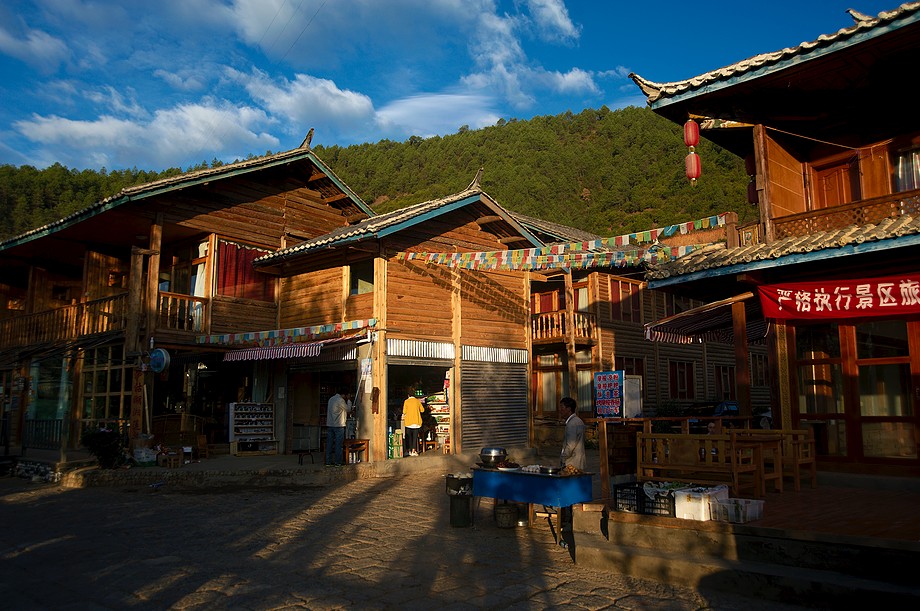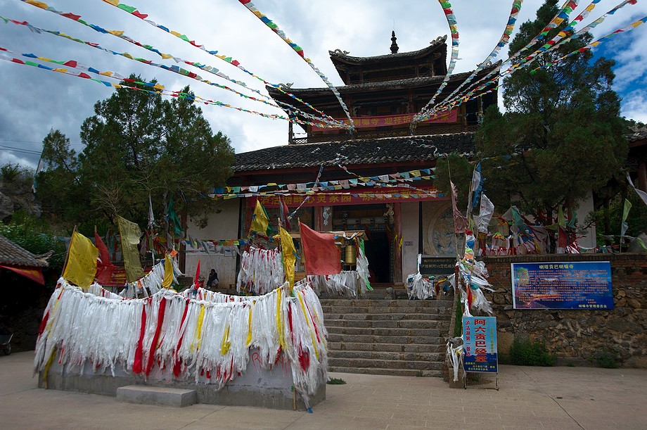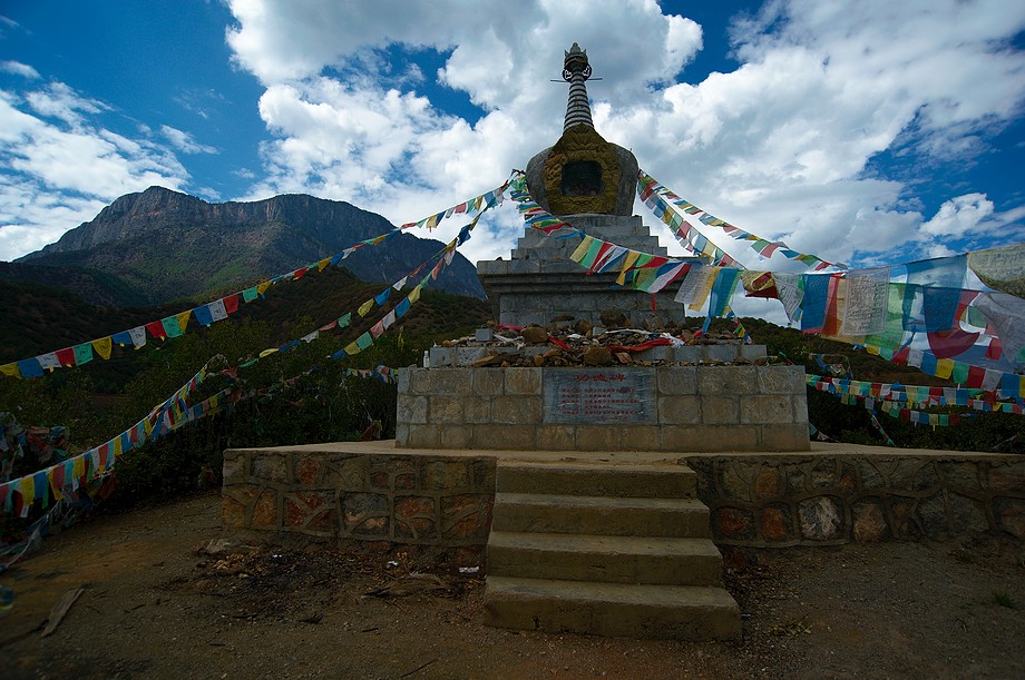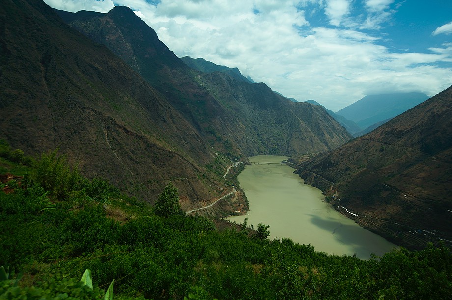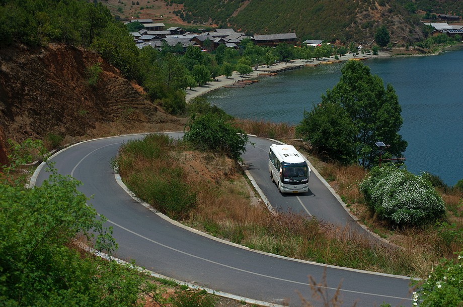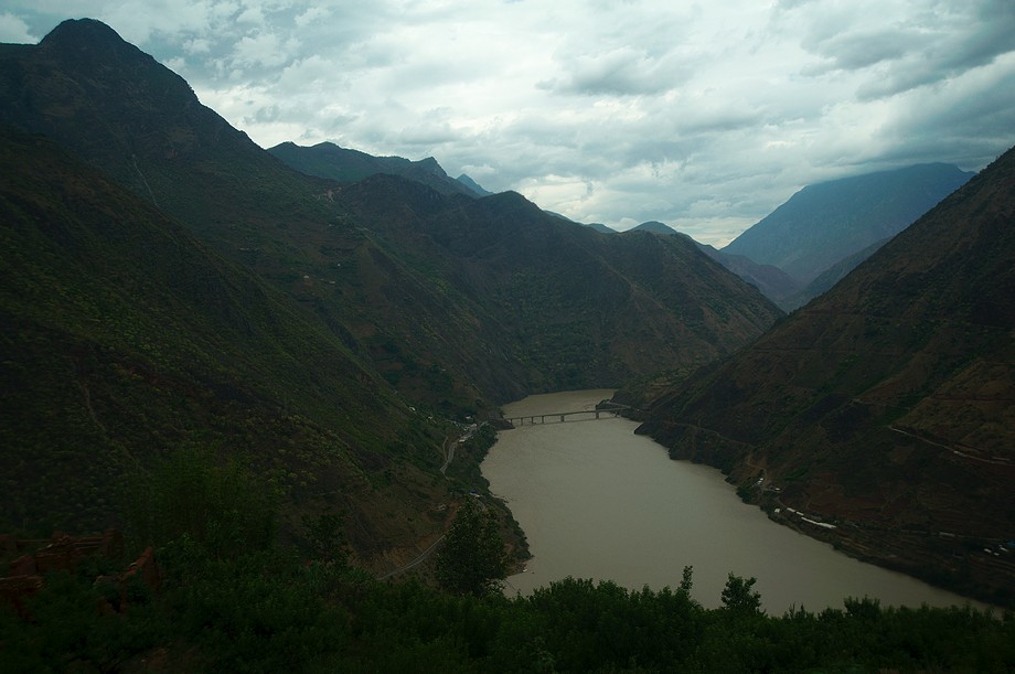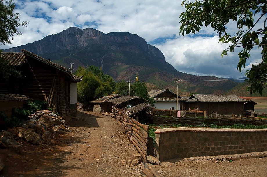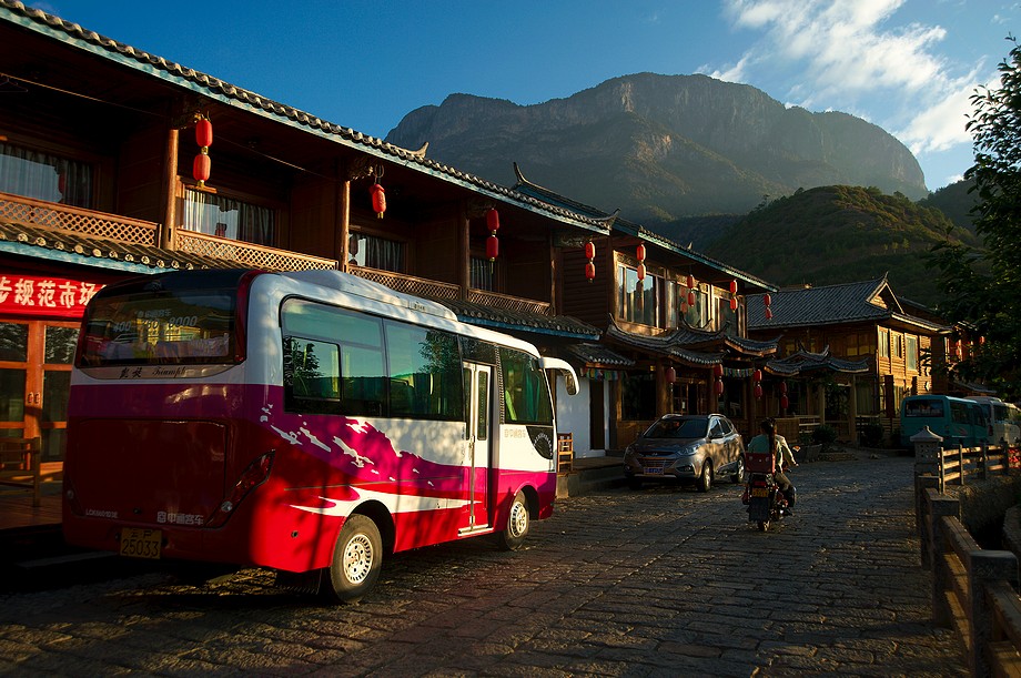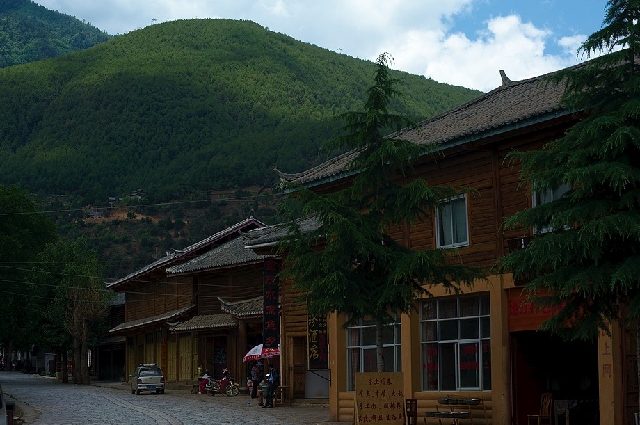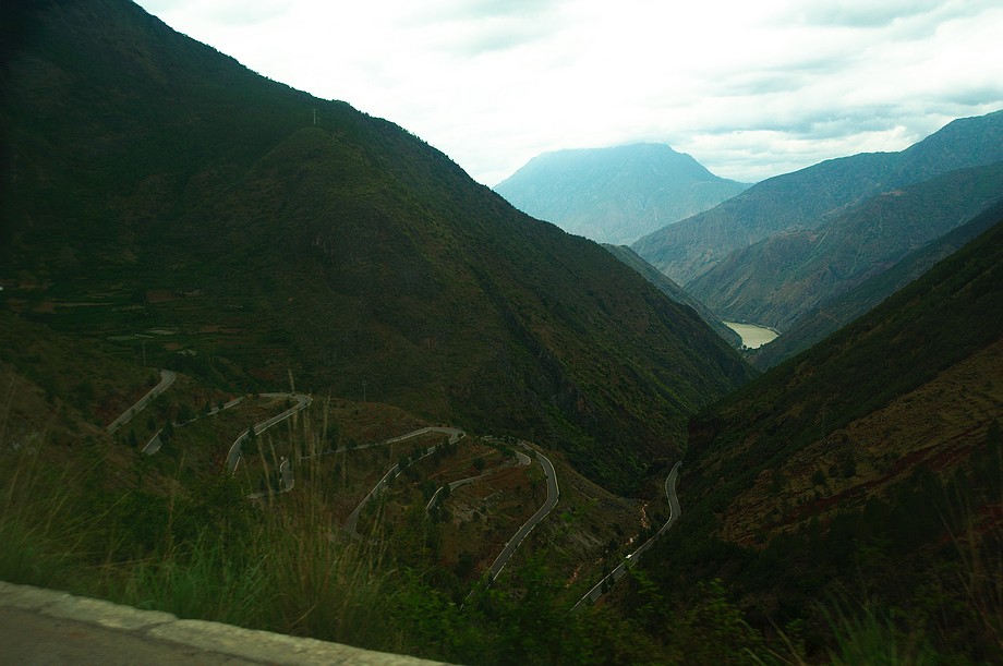 Trasa z Ljiangu z całkiem ładnymi widoczkami, niewiele gorszymi od tych na trasie Shangri La – Deqin, zwłaszcza w okolicach przebijania się przez Yangzi rzekę. Z autobusu zapominam zabrać bluzę (a przydałaby się, bo wieczorami chłodno a się trochę drugiego dnia rozchorowałem, pewnie to od łażenia po deszczu w klapkach w Lijiangu), następnego dnia próbuję poszukać pana kierowcy, bo jest we wsi, ale bezstkutecznie, za to kolejnego dnia pan przyjeżdża znowu o tej samej godzinie z moim ubrankiem tam gdzie zostawiłem.