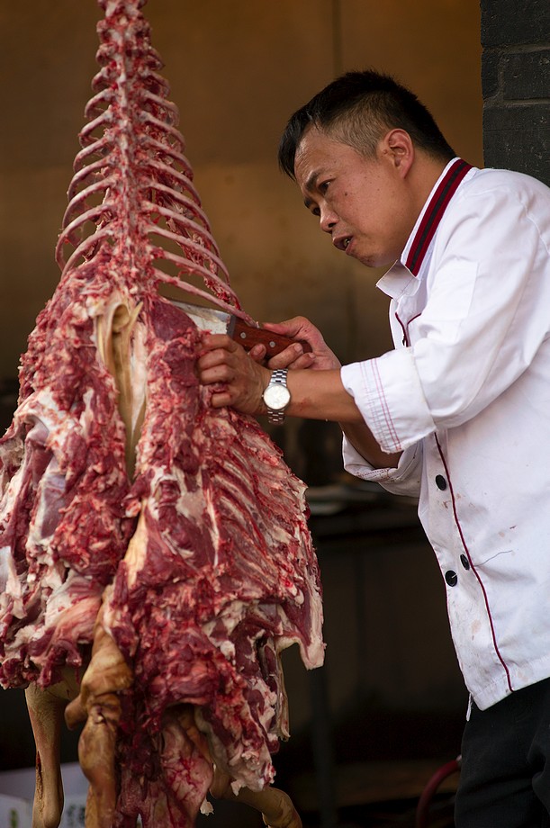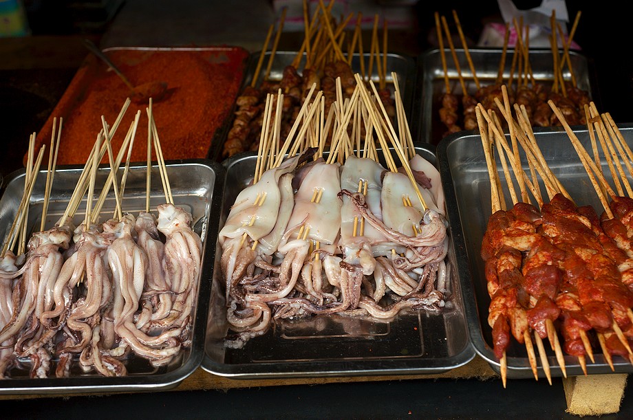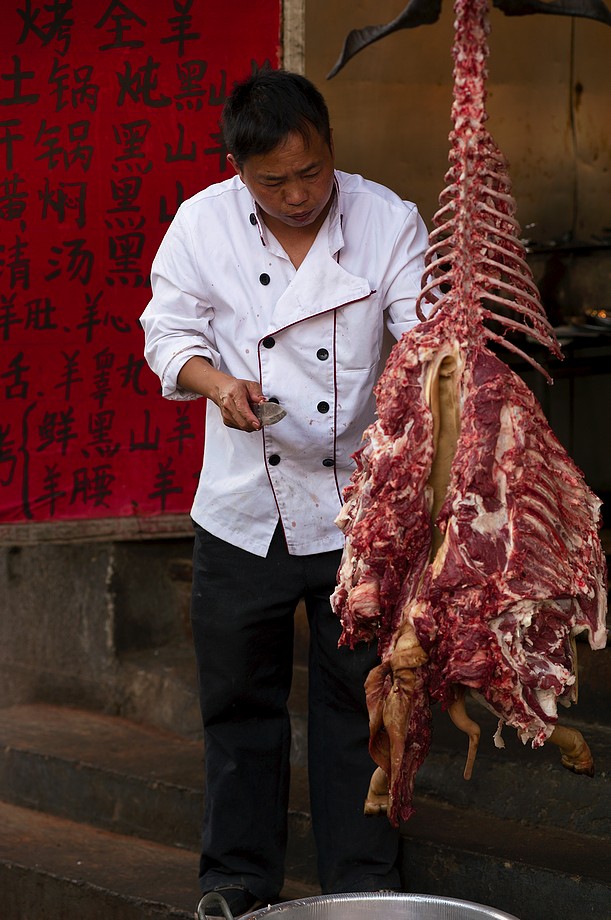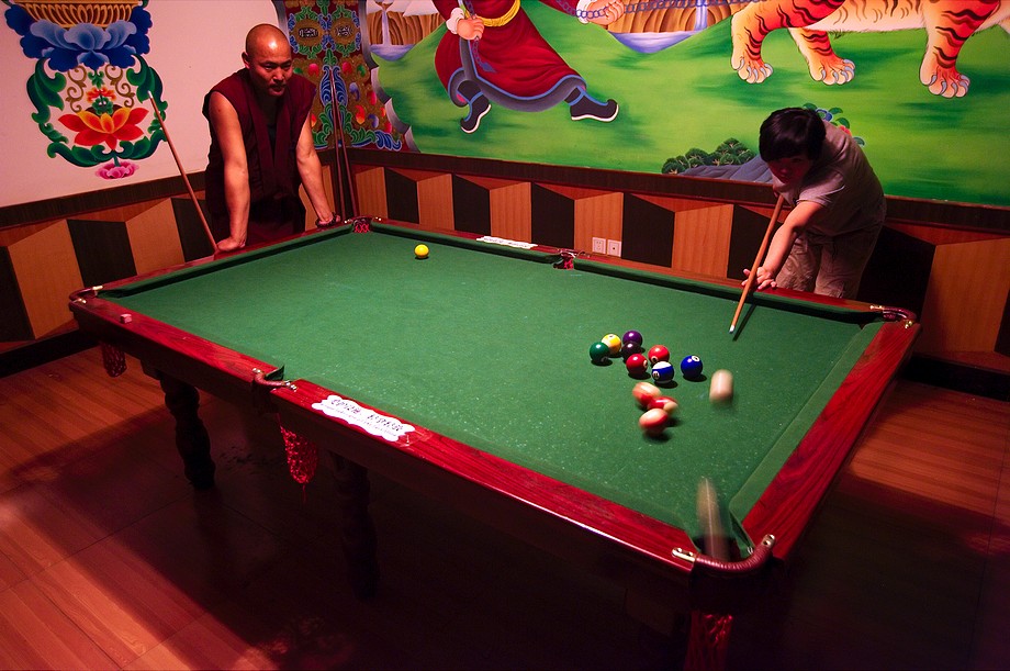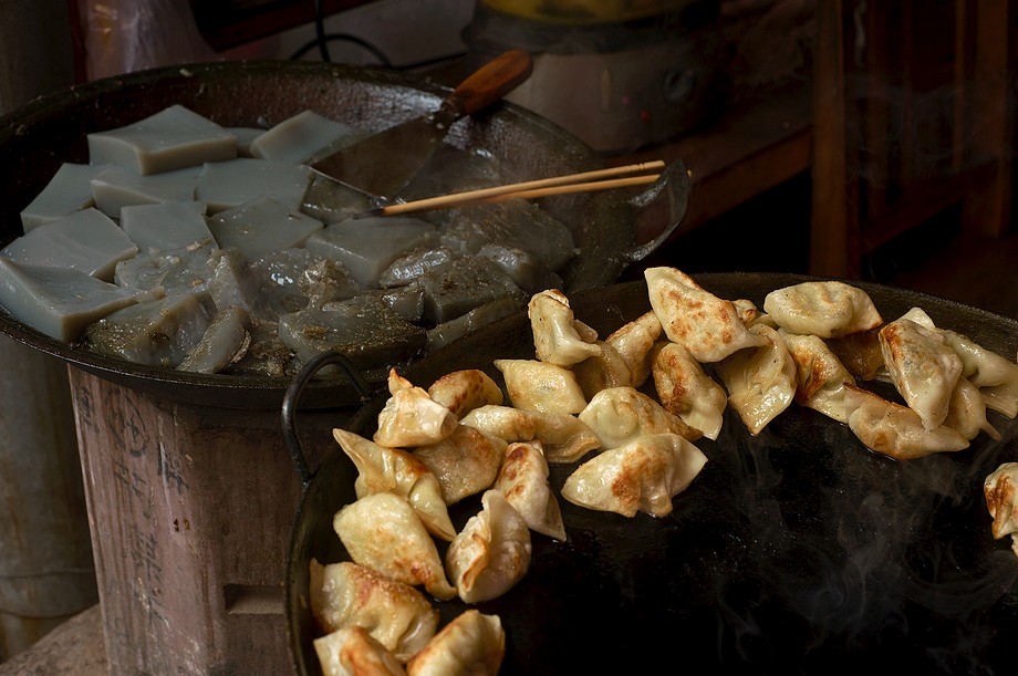 Więc sobie siedzę na miejscu, szpikuję się polopiryną, trzaskam w bilarda z Dalai Lamą i wygrzewam na elektrycznym materacyku. Obczaiłem jedną lokalną knajpę na głównej ulicy, potem jakąś bliżej hotelu z porannymi pierogami, ale głównie stołuję się w jeszcze innej – jedynej knajpie gdzie jest menu z cenami. Co prawda po chińsku, ale lepsze to niż nic. Wybieram to co nie jest strasznie drogie i ma fajne znaczki. Raz tylko na obiad zamówiłem, jak się okazało, talerz prażonych orzeszków… Przynajmniej pani się zlitowała i doniosła mi ryż i jajko.