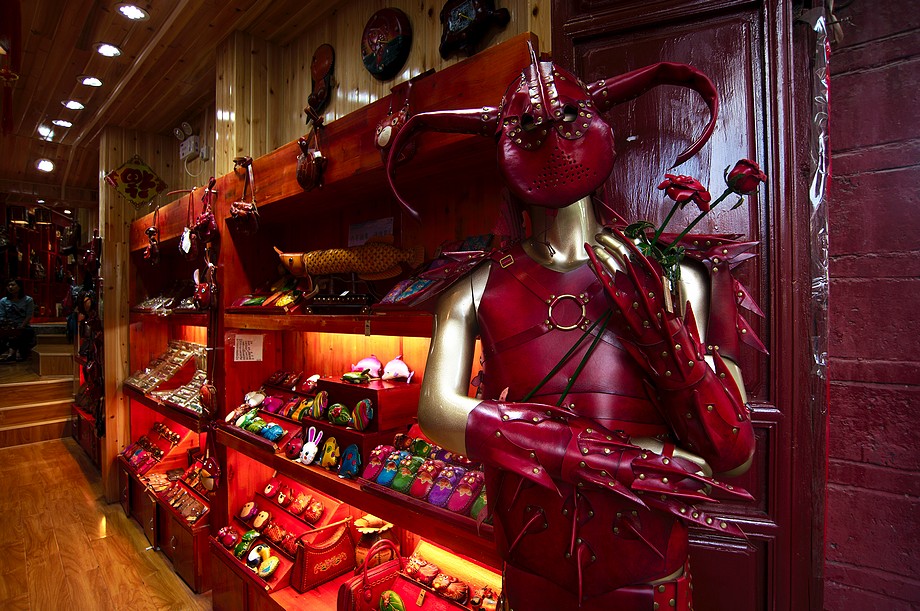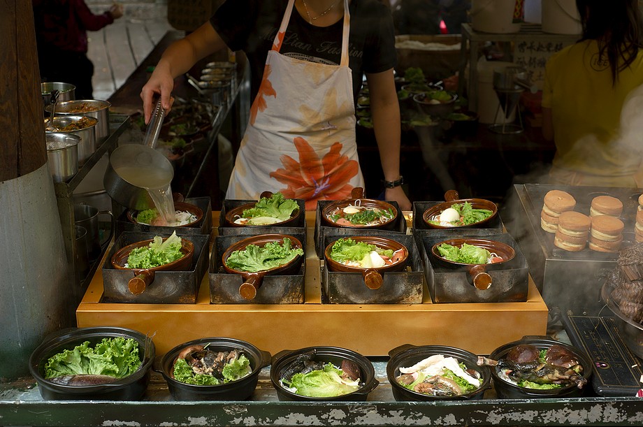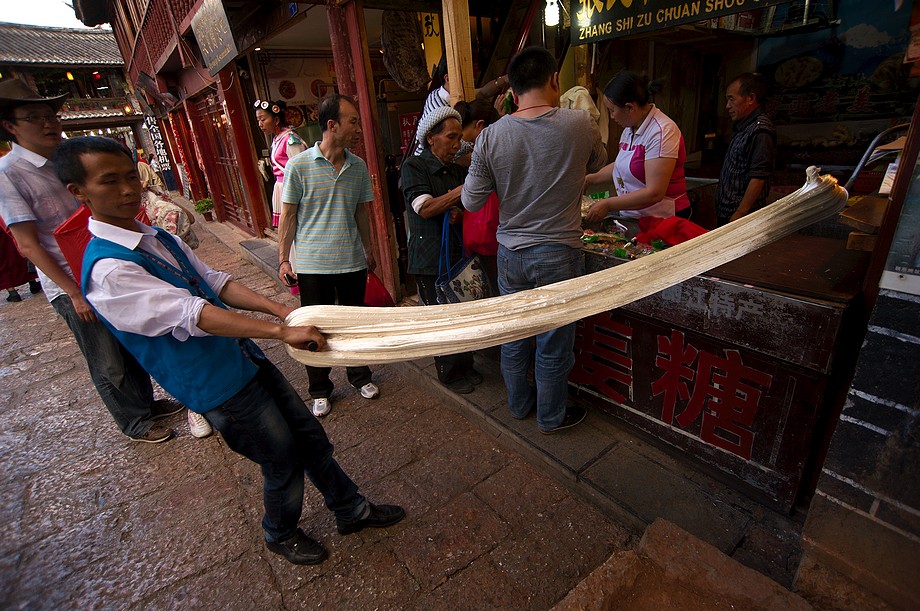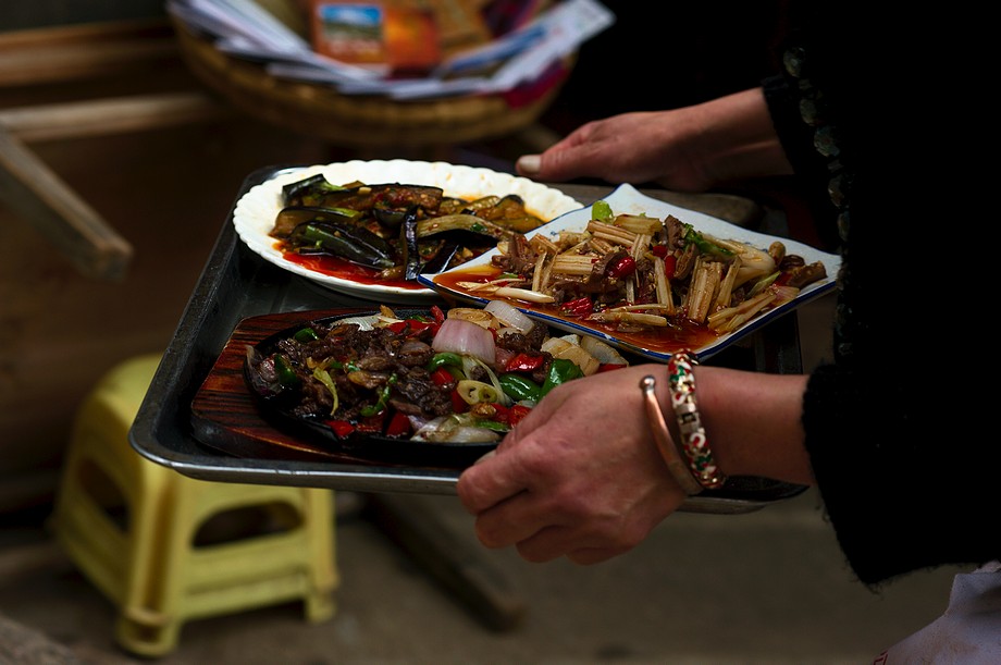 Wieczorem wpadam tam znowu losując kolejne danie, pada na makaron z czymśtam. Na stole obok widzę jakieś lepsze smakołyki. Nie ma ich w menu, bo to gospodarze sobie przygotowali żarcie dla siebie. Ale zapraszają do dosiąścia się, więc się dosiadam. Chwilkę później wyskakuje dziadek-gospodarz z kanistrem. A w kanistrze winko kukurydziane (taka bardziej wóda niż winko, przynajmniej jeśli chodzi o moc). Siedzę sobie, jem swój makaron, rodzinne smakołyki i popijam winkiem. Pani ma translatorek chińsko-angielski więc jakoś się skromnie porozumiewamy. Ale po jakimś czasie dochodzi turysta z Taiwanu, również zachęcony menu z cenami i gadka się rozkręca, bo mówi i po chińsku i po angielsku.