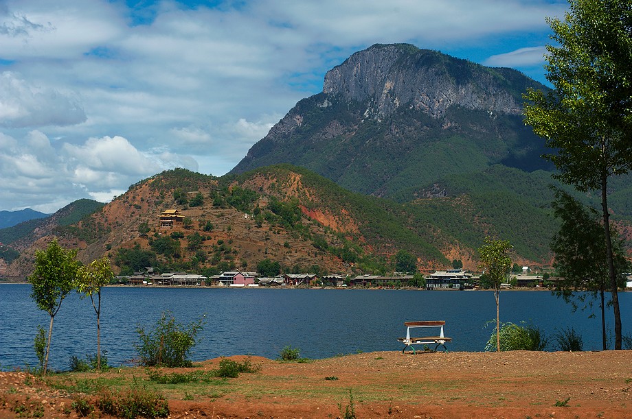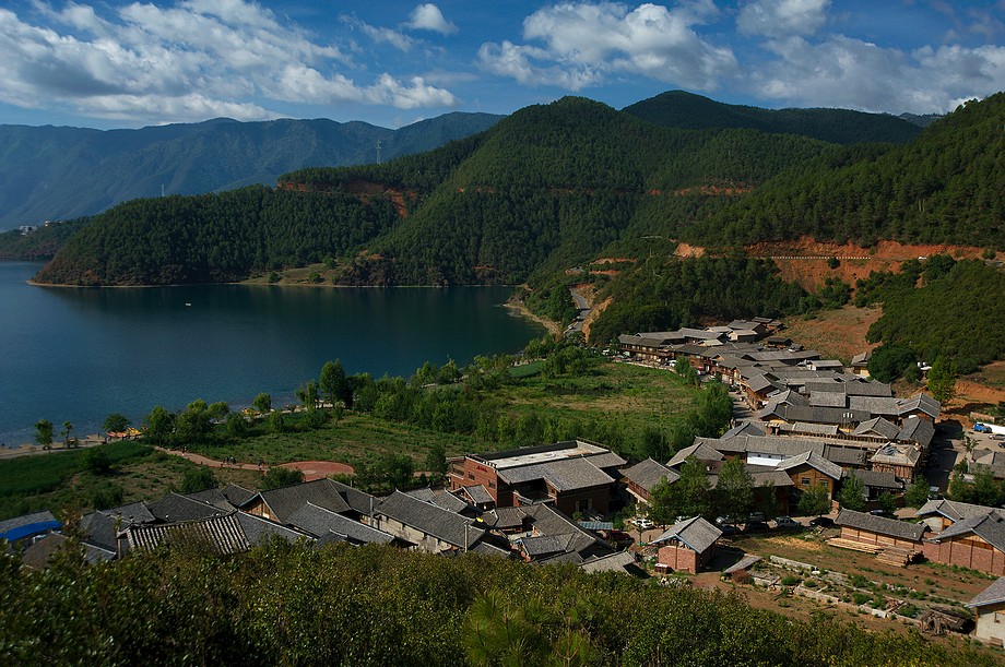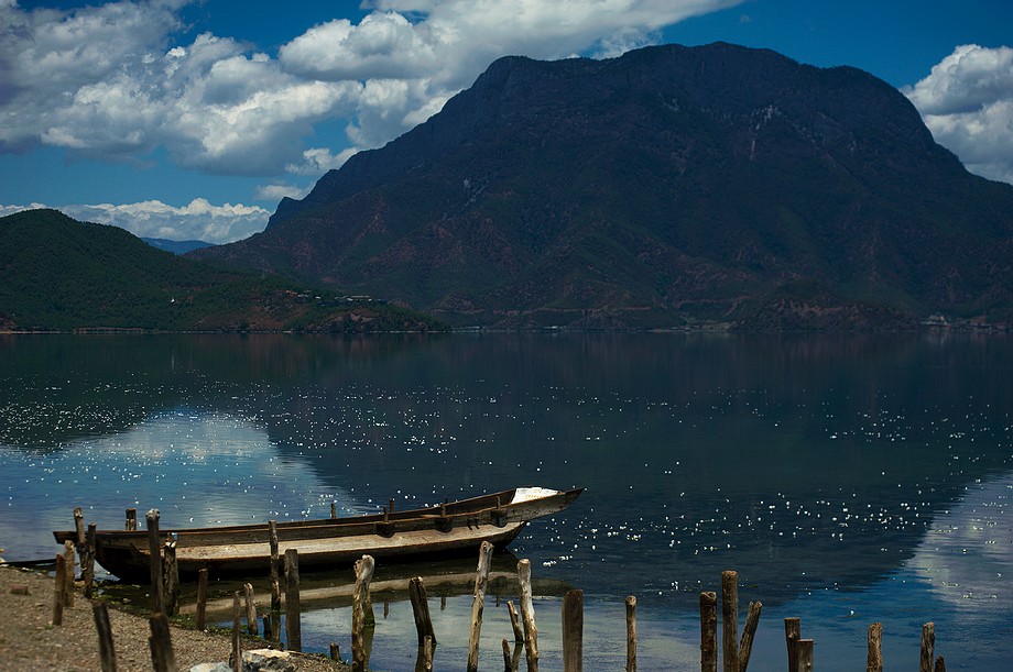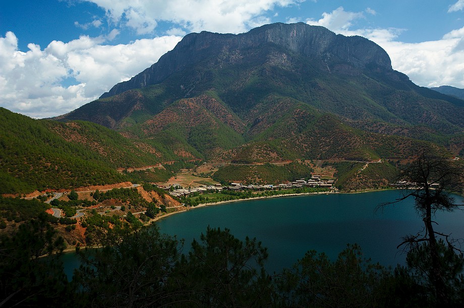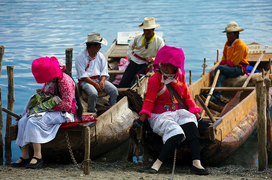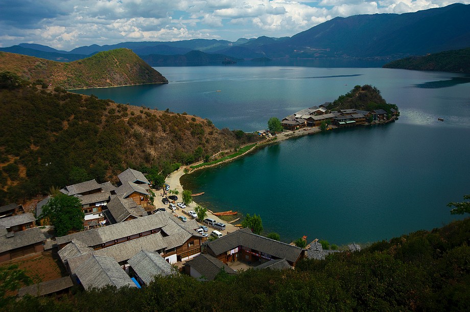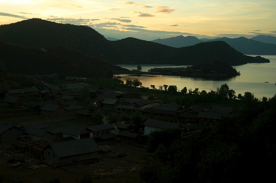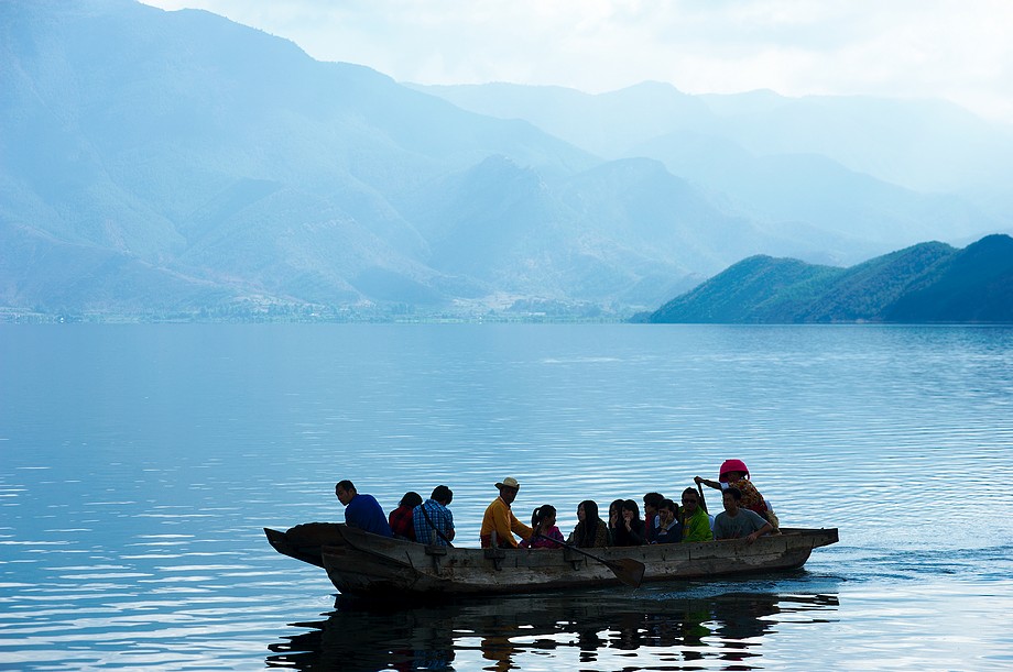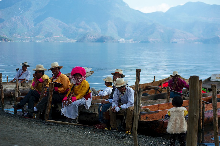 Jezioro – Lugu Hu to po naszemu Lugu Lake – też spoko. Widoczek jest tuż za kasą biletową (gdzie poza biletem dostajemy Women’s Kingdom Passport i jakieś broszurki) ale po raz pierwszy ukazuje się kawałek przed nią, tuż za wyjazdem z tunelu – cały autobus spontanicznie na jego widok zaczyna klaskać. Za wjazd trzeba zabulić tu 100y, poza 80y za sam autobus, więc trochę droga impreza. Pół minuty za ową kasą kierowca się zatrzymuje i oświadcza, że jest przerwa na fotografię, więc wszystkie chińczyki wyskakują na zewnątrz i robią sobie fotki. Okolice chyba też mają potencjał, chociaż nigdzie się nie zapuszczam bo się kuruję. Ale jest na tyle ok, że z chęcią zostałbym dłużej, tylko problem w tym, że muszę wracać do Lijiangu załatwić jedną sprawę z Biurem Bezpieczeństwa.