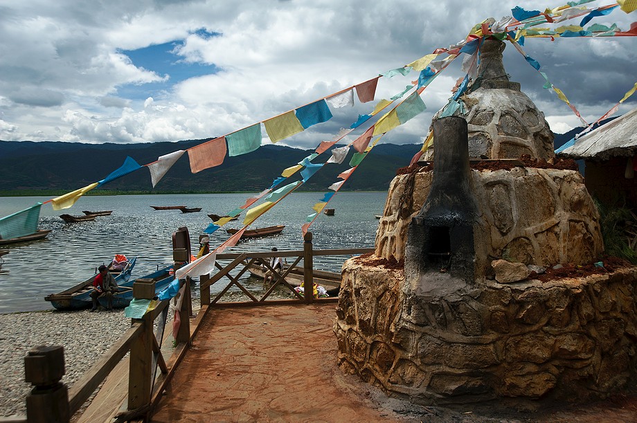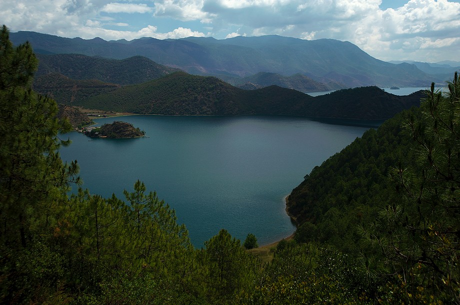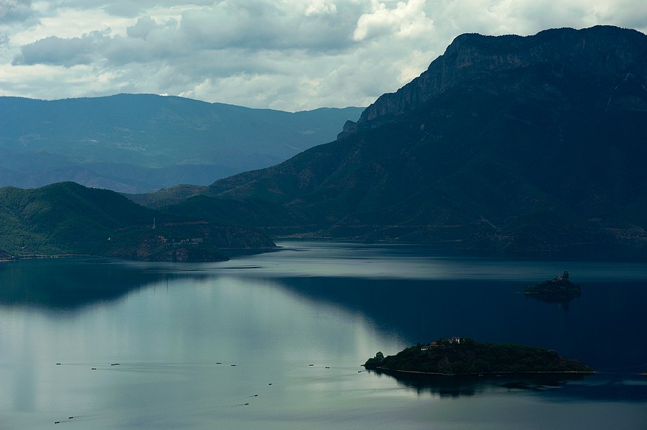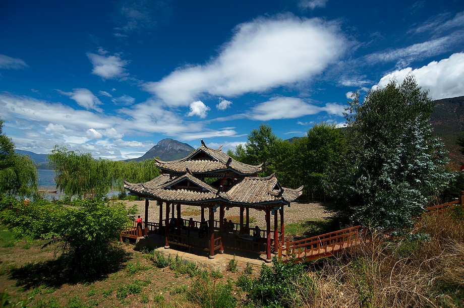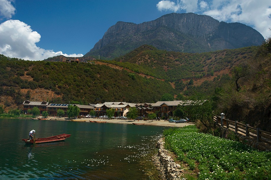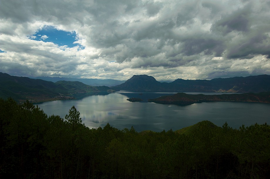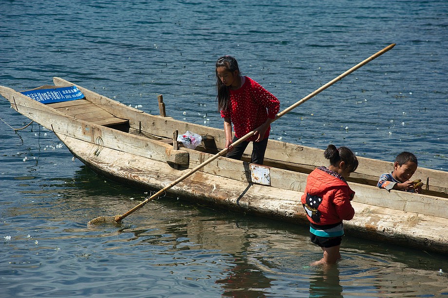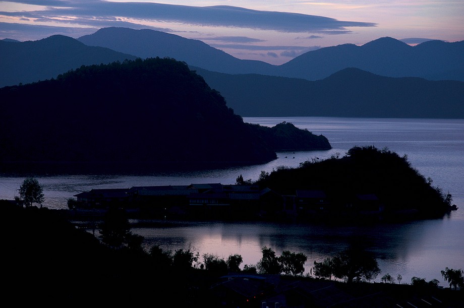 Jezioro – Lugu Hu to po naszemu Lugu Lake – też spoko. Widoczek jest tuż za kasą biletową (gdzie poza biletem dostajemy Women’s Kingdom Passport i jakieś broszurki) ale po raz pierwszy ukazuje się kawałek przed nią, tuż za wyjazdem z tunelu – cały autobus spontanicznie na jego widok zaczyna klaskać. Za wjazd trzeba zabulić tu 100y, poza 80y za sam autobus, więc trochę droga impreza. Pół minuty za ową kasą kierowca się zatrzymuje i oświadcza, że jest przerwa na fotografię, więc wszystkie chińczyki wyskakują na zewnątrz i robią sobie fotki. Okolice chyba też mają potencjał, chociaż nigdzie się nie zapuszczam bo się kuruję. Ale jest na tyle ok, że z chęcią zostałbym dłużej, tylko problem w tym, że muszę wracać do Lijiangu załatwić jedną sprawę z Biurem Bezpieczeństwa.