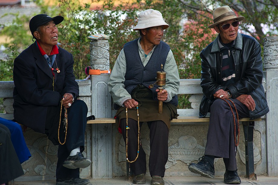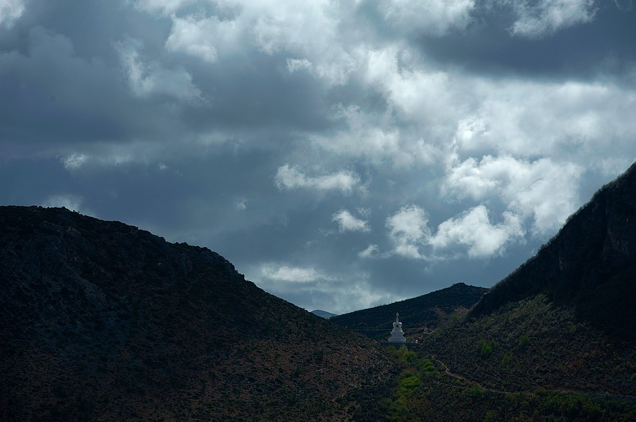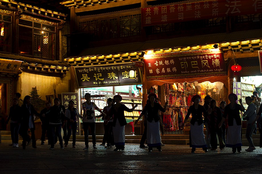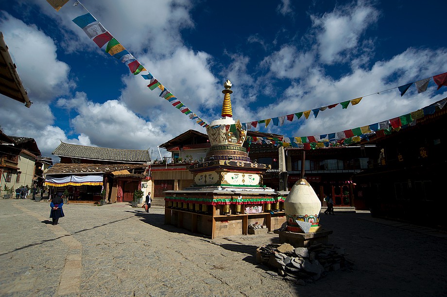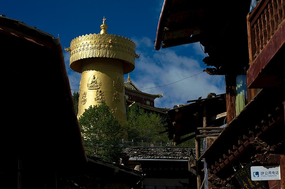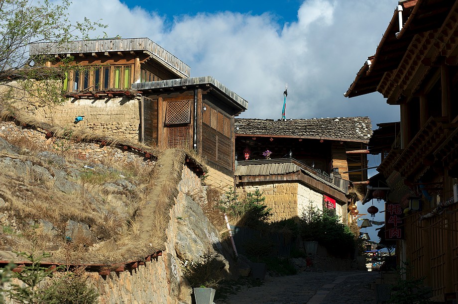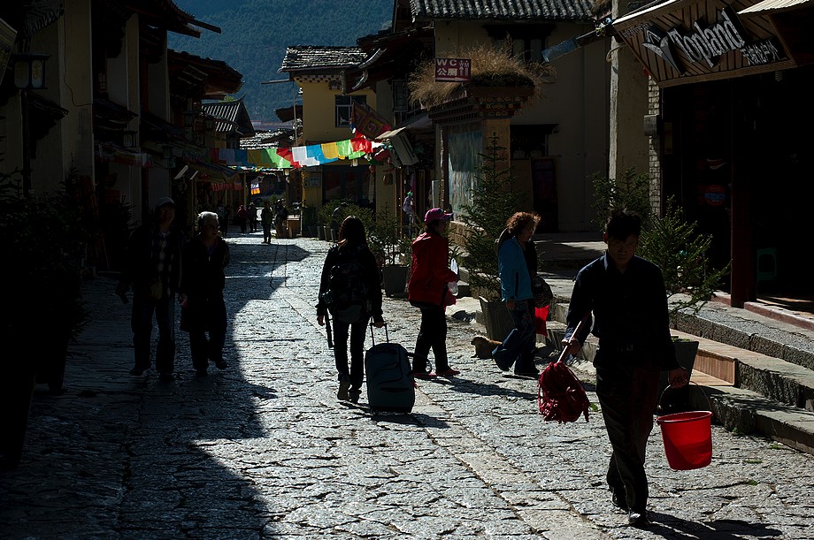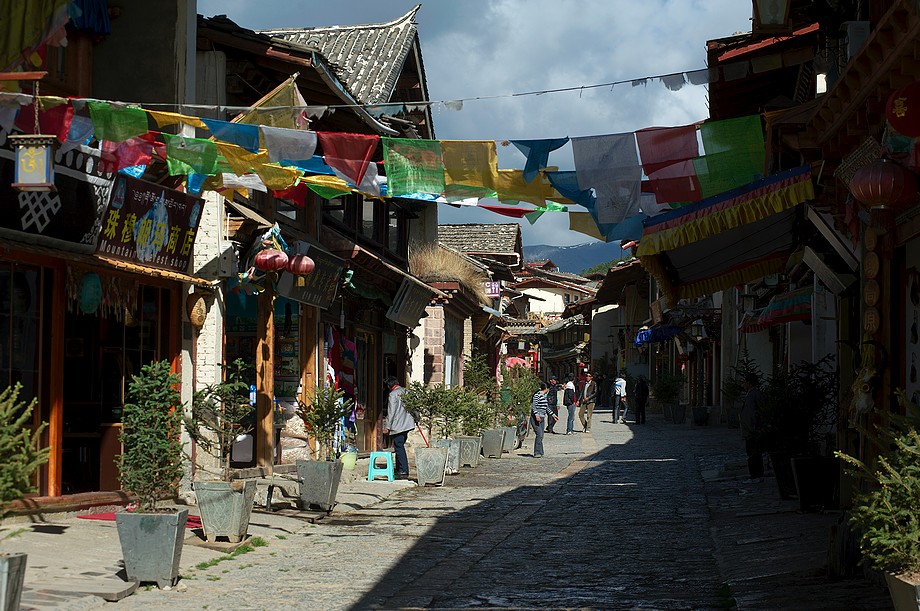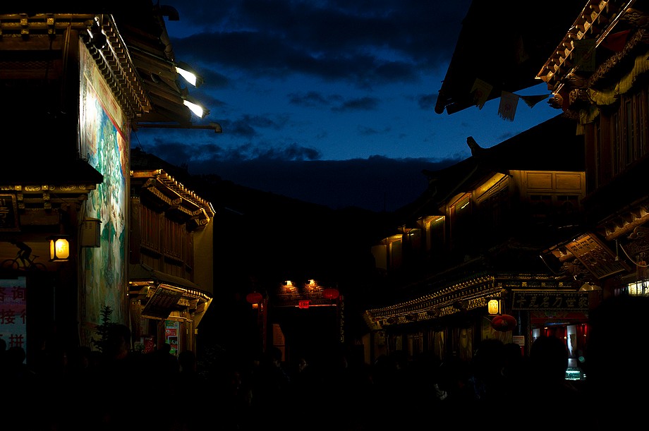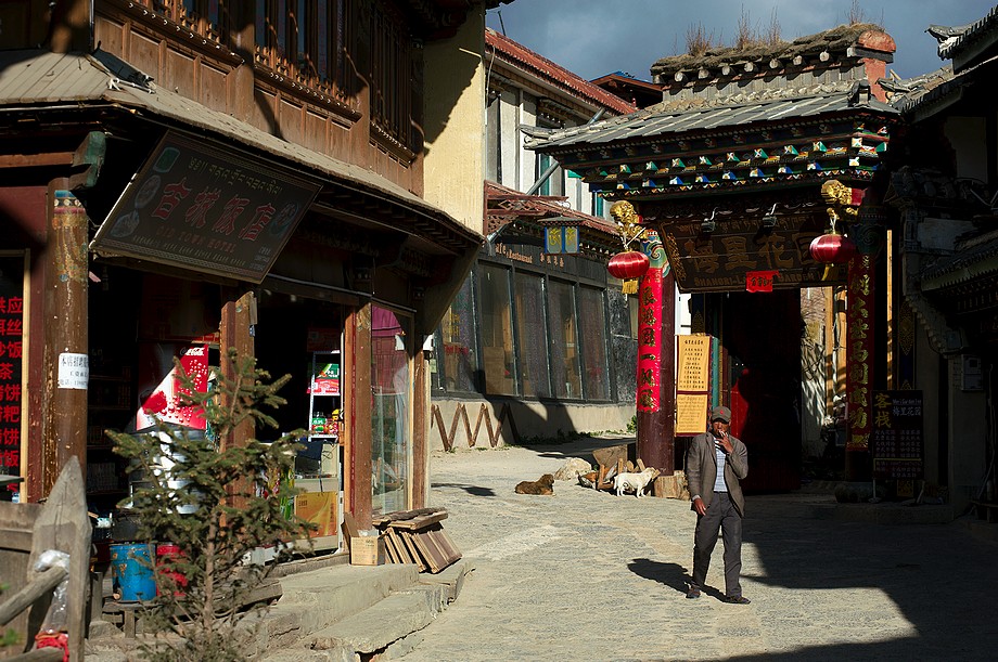 Busik trochę mniej przyjemny niż ten z Jinghongu, ciaśniej i śmierdzi skarpetkami. Z krótkim noclegiem gdzieś nie wiadomo gdzie po 11h jazdy docieram do Shangri La. 3500m npm, ale jakoś tego nie czuję, poza tym, że o 6ej rano jest zimno a ja w krótkim rękawku, krótkich spodenkach i sandałkach. Ale po założeniu wszystkich pozostałych ubrań łącznie z czapką (tybetańską z Sikkimu) jest ok. Główne miasto takie sobie, ale po dotarciu do starówki akurat jest fantastyczne wschodzące słoneczko więc z plecarami jeszcze przed zameldowaniem się w hotelu robię zdjęciową rundkę dookoła. Oczywiście Krupówki, sklep na sklepie, hordy turystów, ale przynajmniej wygląda to jak stare miasto a nie jak zachwalane niewiadomoco np. w Chiang Mai, gdzie stare to jedynie były świątynie i szczątki murów dookoła.