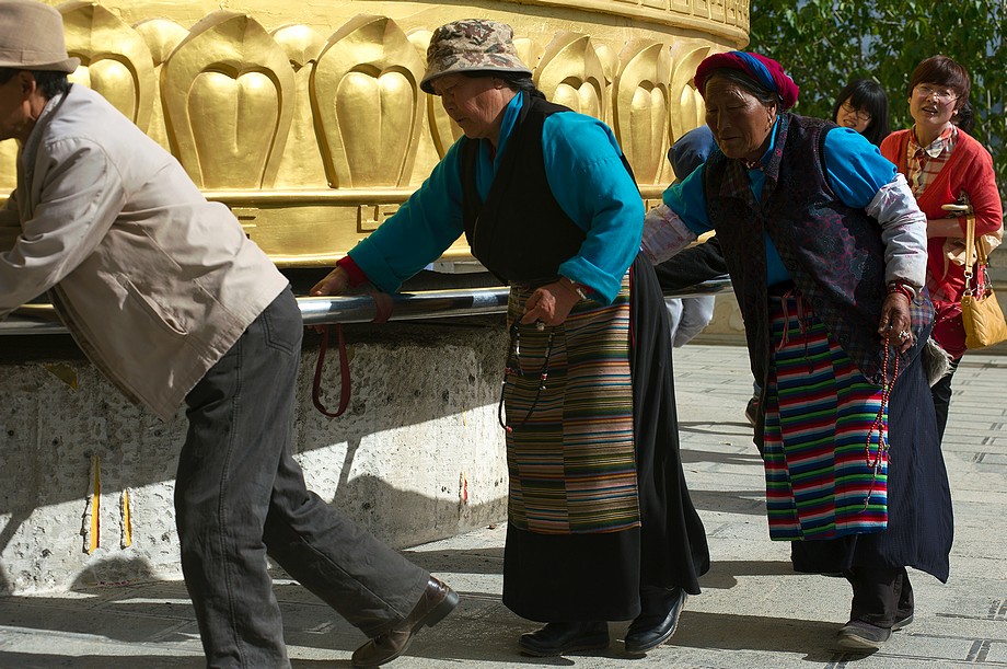 W pobliżu jest buddyjskie coś, z buddyjskim kręciołkiem, tylko takim dużym. Bardzo dużym. Z daleka widzę, że się kręci, obstawiam, że tak samo z siebie, ale dopiero po dotarciu na miejsce widzę jak ludzie z trudem ciągną kręciołę za sznurki, ciężko idzie (wiem, bo się dołączam do imprezy), po 2-3 obrotach chwila odpoczynku i zostaje tylko łażenie dookoła. A potem jeszcze raz.